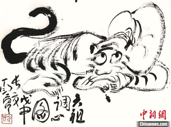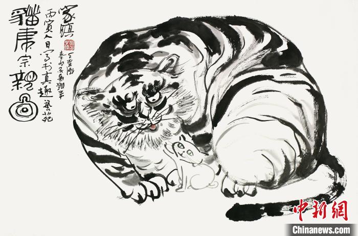 歷代繪畫中,虎的形象有時也可親可愛,甚至會與貓狸混淆。展品中的鄭家鎮漫畫《貓虎宗親圖》造型誇張,虎與貓、龐碩與嬌小、花與白形成了強烈對比。白貓似要「捋虎須」,兩者眼神摩擦出奇妙火花。