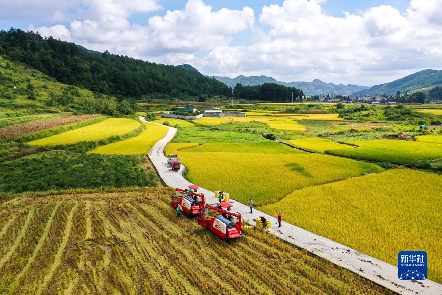 2021年9月15日,貴州省龍裏縣灣灘河鎮羊場社區的農民在搶收稻穀(無人機照片)。(新華社記者 楊文斌 攝)