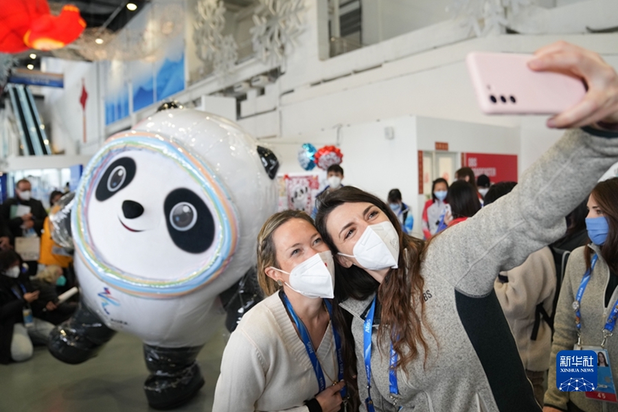 2月12日,北京冬奧會主媒體中心舉辦集體採訪活動,現場觀眾與北京2022年冬奧會吉祥物「冰墩墩」自拍留念。(新華社記者 鞠煥宗 攝)