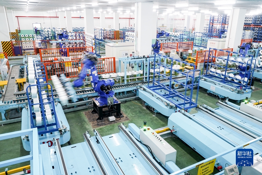 2021年5月14日,在位於江蘇省蘇州市吳江區盛澤鎮的一家智能車間,機器人在車間內自動作業。(新華社記者 李博 攝)