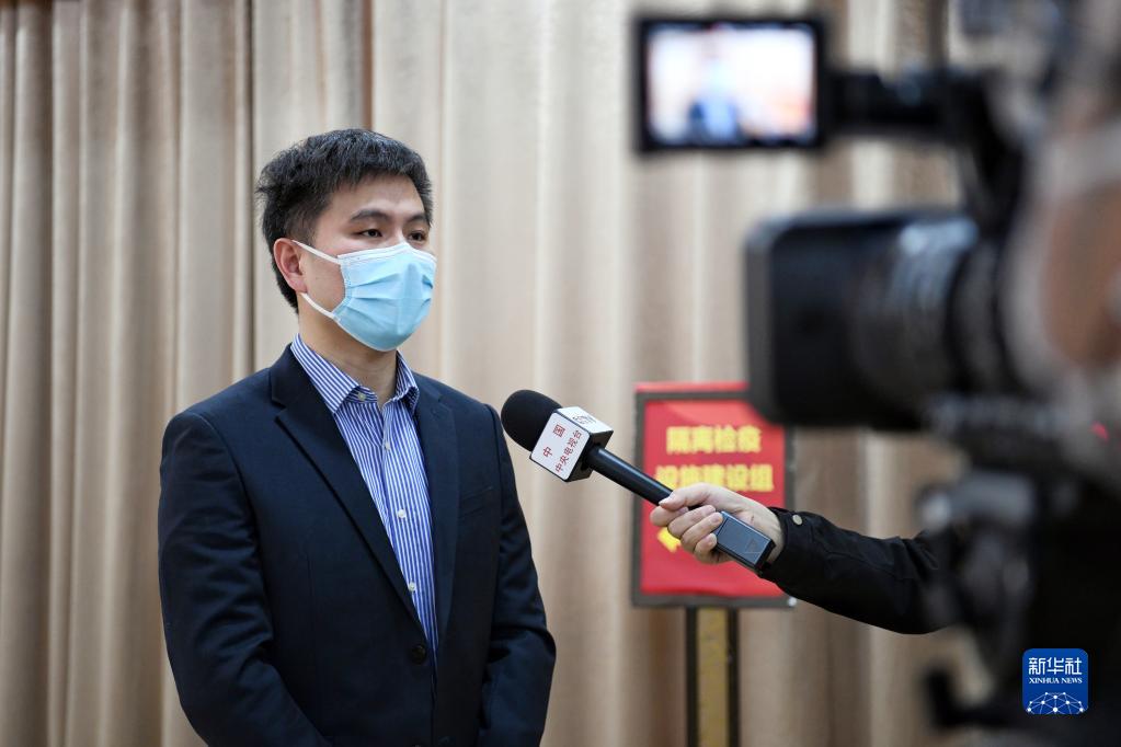 2月22日,內地支援香港抗疫工作專班隔離檢疫設施建設組成員謝暉接受媒體採訪,介紹相關情況。(新華社記者 梁旭 攝)