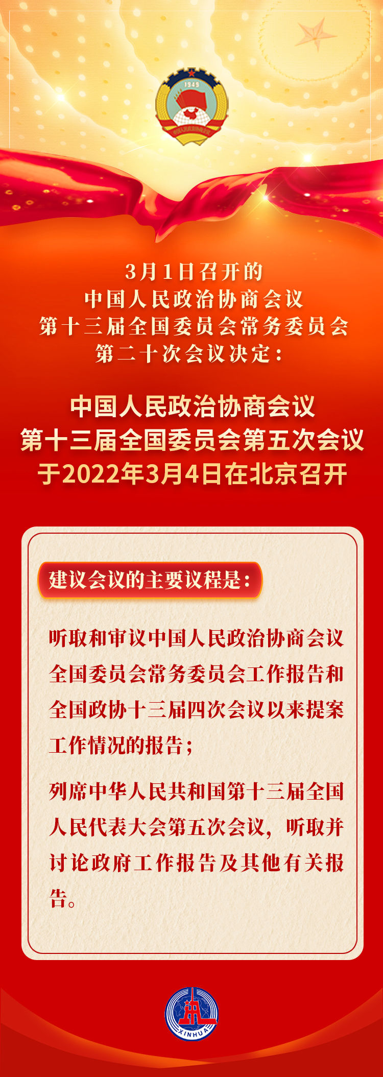 中國人民政治協商會議第十三屆全國委員會常務委員會第二十次會議決定:中國人民政治協商會議第十三屆全國委員會第五次會議於2022年3月4日在北京召開。建議會議的主要議程是:聽取和審議中國人民政治協商會議全國委員會常務委員會工作報告和全國政協十三屆四次會議以來提案工作情況的報告;列席中華人民共和國第十三屆全國人民代表大會第五次會議,聽取並討論政府工作報告及其他有關報告。