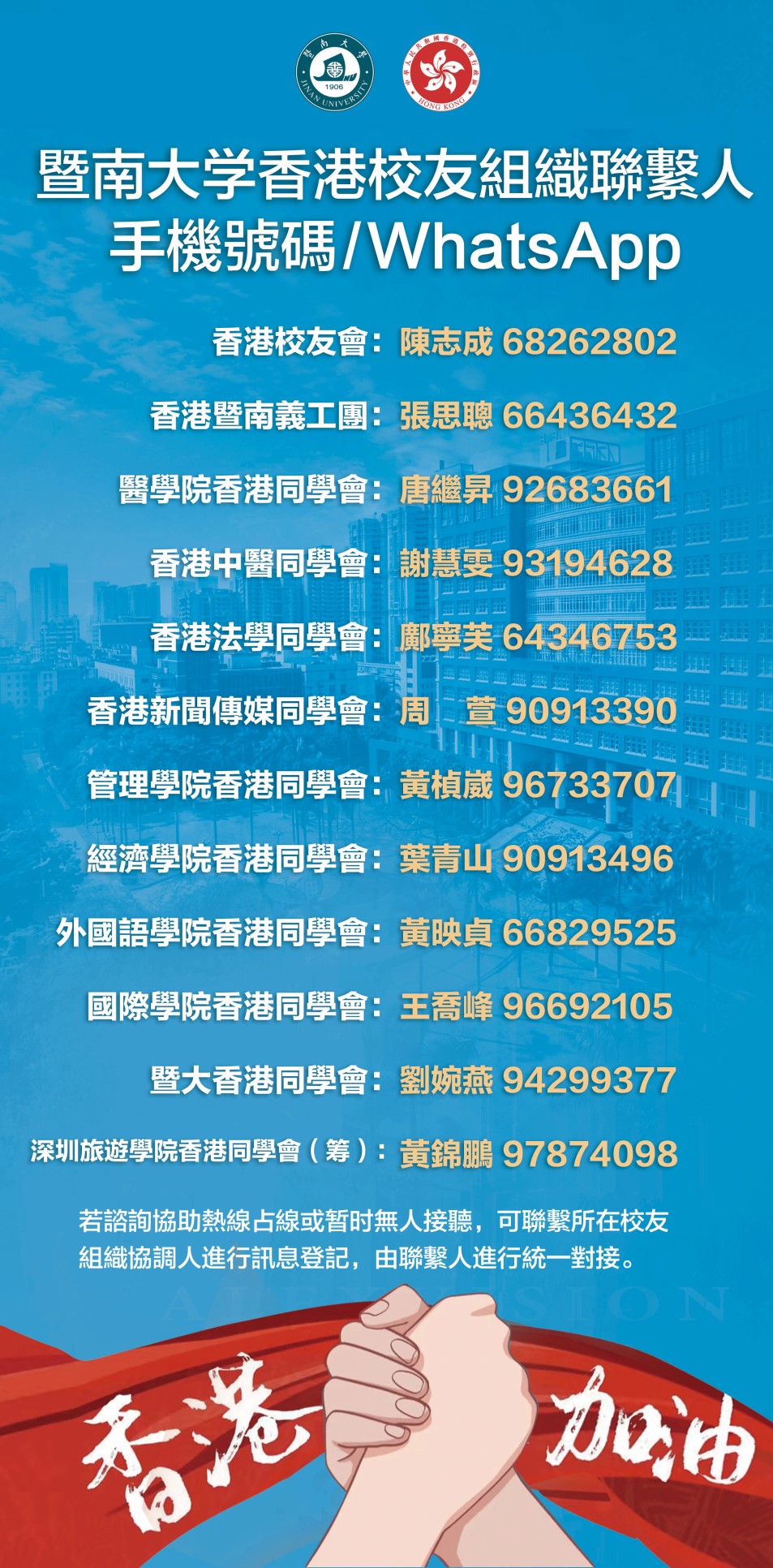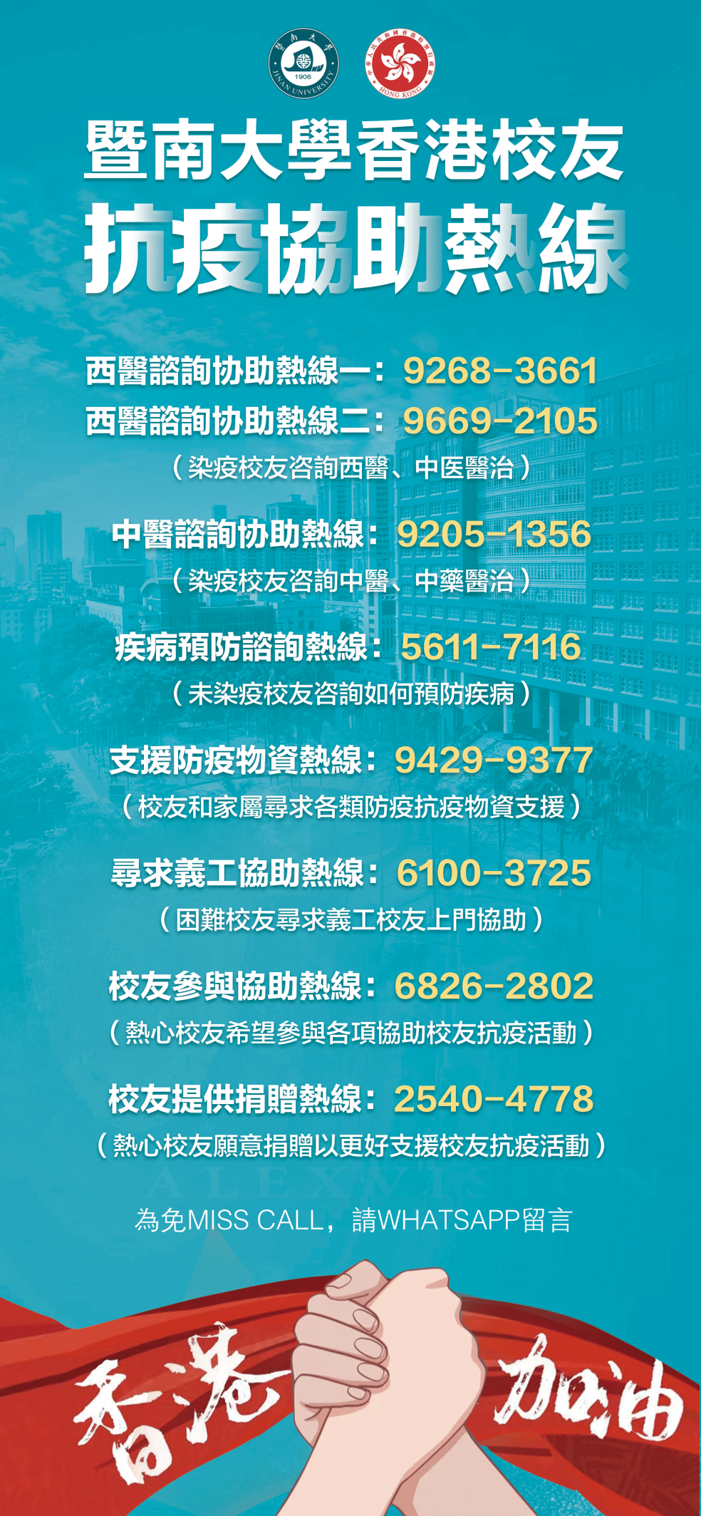 日前,為聯合多方力量共同抗疫,暨南大學校友總會與駐香港辦事處多方聯動,搭建「暨南香港抗疫互助工作小組」微信群,邀請主要的內地校友組織和港澳校友組織主要負責人參與其中,快速組織香港校友搭建8條香港校友抗疫協助熱線(WhatsApp)、發布防疫信息、協助感染人群和對接防疫抗疫物資等工作,將灣區暨南校友、醫療等資源最大化地用於援助香港校友,也便於香港校友互利互助、齊心抗疫。