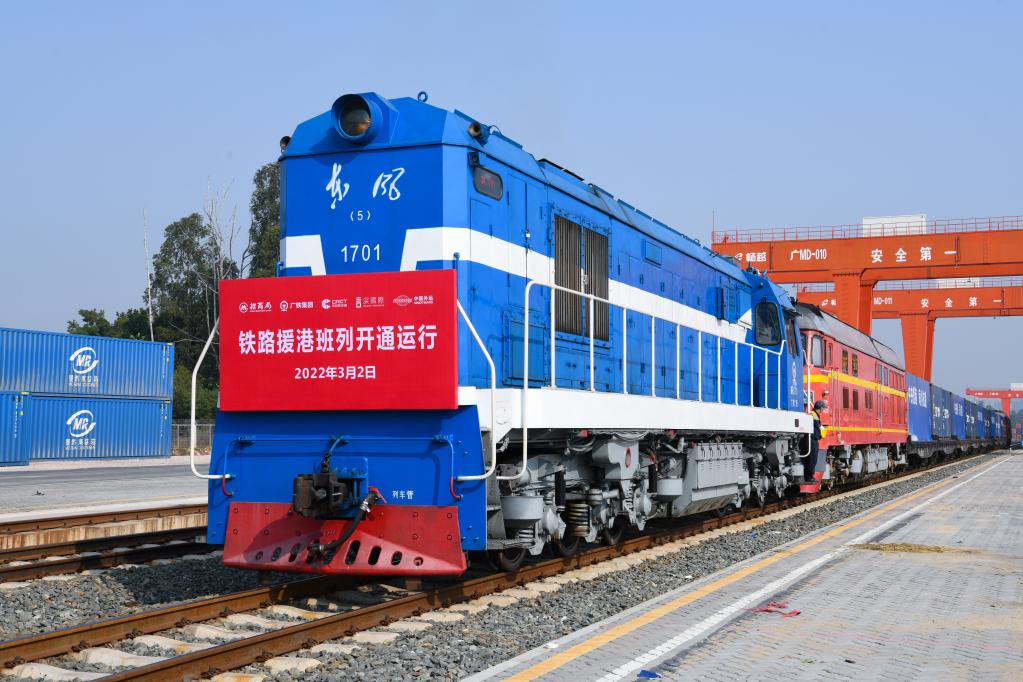 3月2日,首趟「中央援港 同心抗疫」鐵路援港班列駛出深圳平湖南國家物流樞紐。(新華社記者 梁旭 攝)