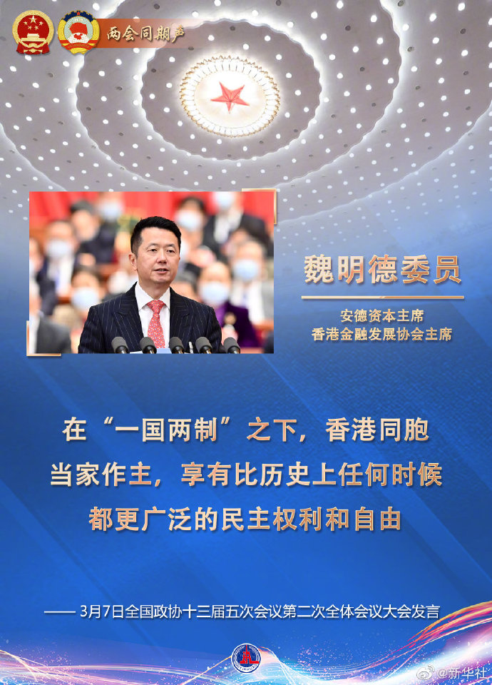 各位委員,香港第五波新冠肺炎疫情爆發後,習近平總書記十分關心,專門作出重要指示,中央全力支援香港抗疫,積極調配醫護人員,有力統籌防疫物資,着力保障民生所需。我們堅信,在中共中央堅強領導下,以港為家園,以國為後盾,我們一定能打贏這場抗疫阻擊戰。疫情過後,香港必將重現「東方之珠」的光彩,必將更好發揮獨特優勢和作用,為世界和平發展作出貢獻,共同推動構建人類命運共同體。