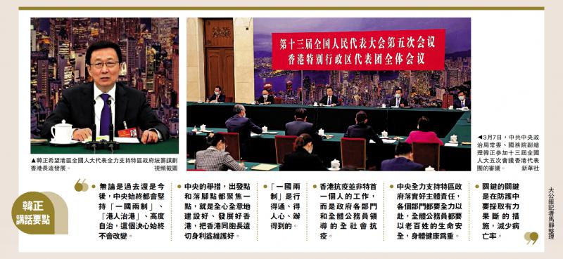 中共中央政治局常委、國務院副總理韓正3月7日上午參加十三屆全國人大五次會議香港代表團審議並發表重要講話。香港全國人大代表團新聞發言人陳勇在會後對媒體表示,韓正副總理在講話中重申,無論是過去還是今後,中央始終都會堅持「一國兩制」、「港人治港」、高度自治,這個決心始終不會改變。中央制定出台的舉措,都是為了香港長期繁榮穩定和長治久安,維護香港同胞長遠切身利益。