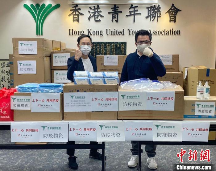 香港立法會議員、香港青年聯會主席梁毓偉及香港青年聯會常務副主席楊政龍接收捐贈物資。(香港青年聯會供圖)