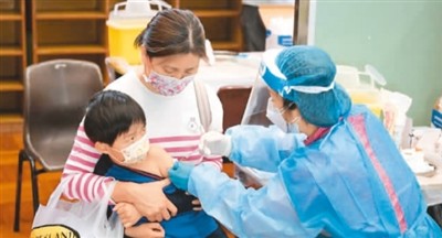 香港特區政府葵青民政事務處、葵青地區抗疫連線、青衣區小學校長會、荃灣及葵青幼稚園校長會近日在長亨社區會堂合辦葵青區兒童科興疫苗接種活動。圖為工作人員為兒童提供疫苗接種。(中新社記者 陳永諾 攝)