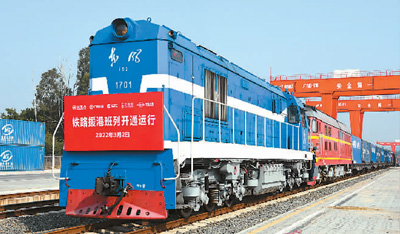 三月二日,首趟「中央援港同心抗疫」鐵路援港班列駛出深圳平湖南國家物流樞紐。(新華社記者 梁 旭攝)