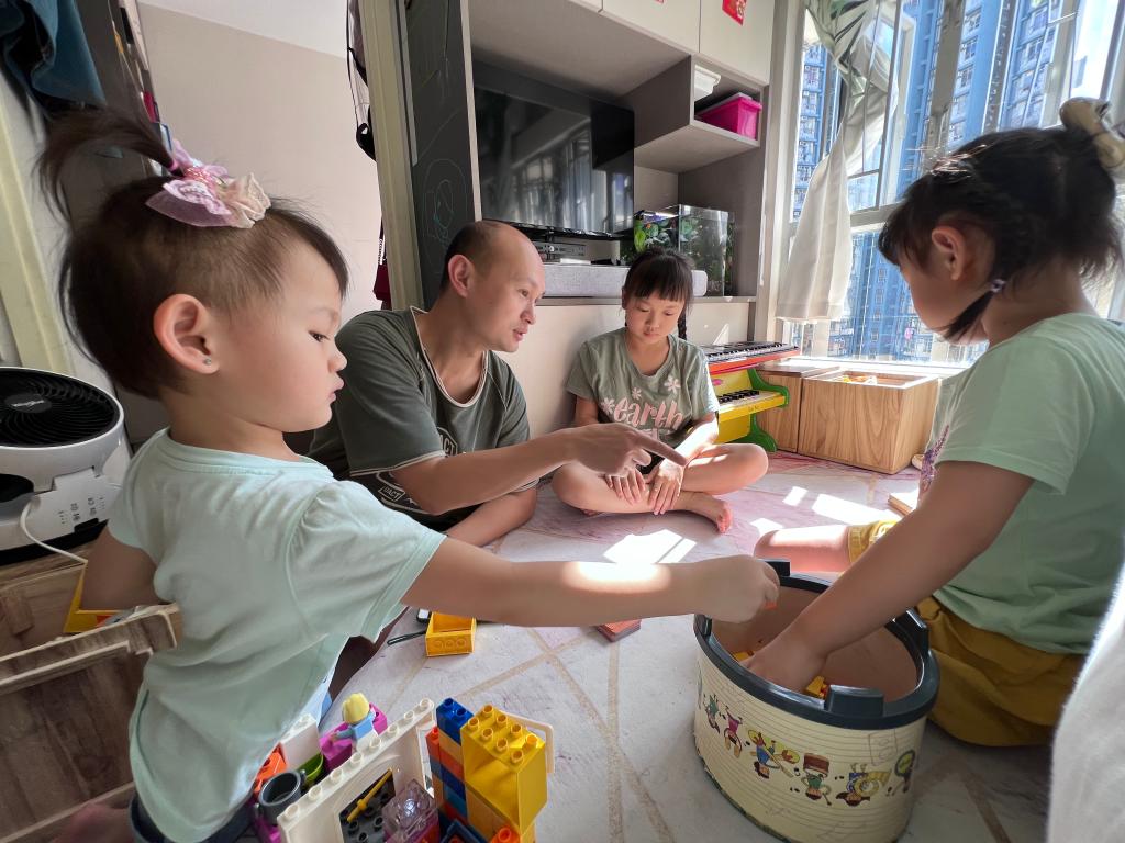 周老師的丈夫彭先生帶着三個女兒搭積木(3月31日攝)。(新華社記者 張玥 攝)