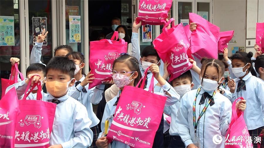 中央援港抗疫派發現場,學生們領取抗疫物資包。(人民網 嚴小晶 攝)