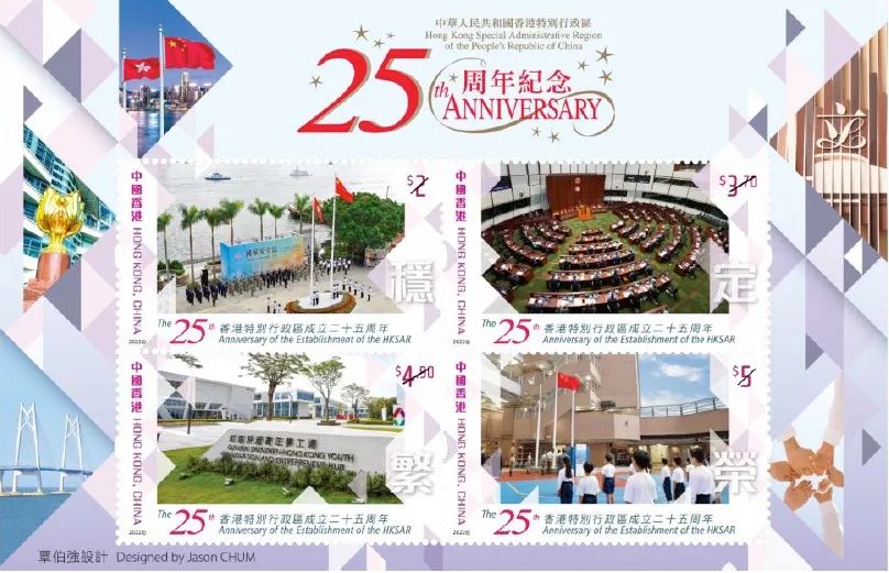 為紀念香港特區成立25周年,香港郵政將於7月發行一套四枚紀念郵票、一張小全張和相關集郵品。此外,香港郵政還將以「中國人民解放軍進駐香港25周年」為主題,發行一張郵票小型張。