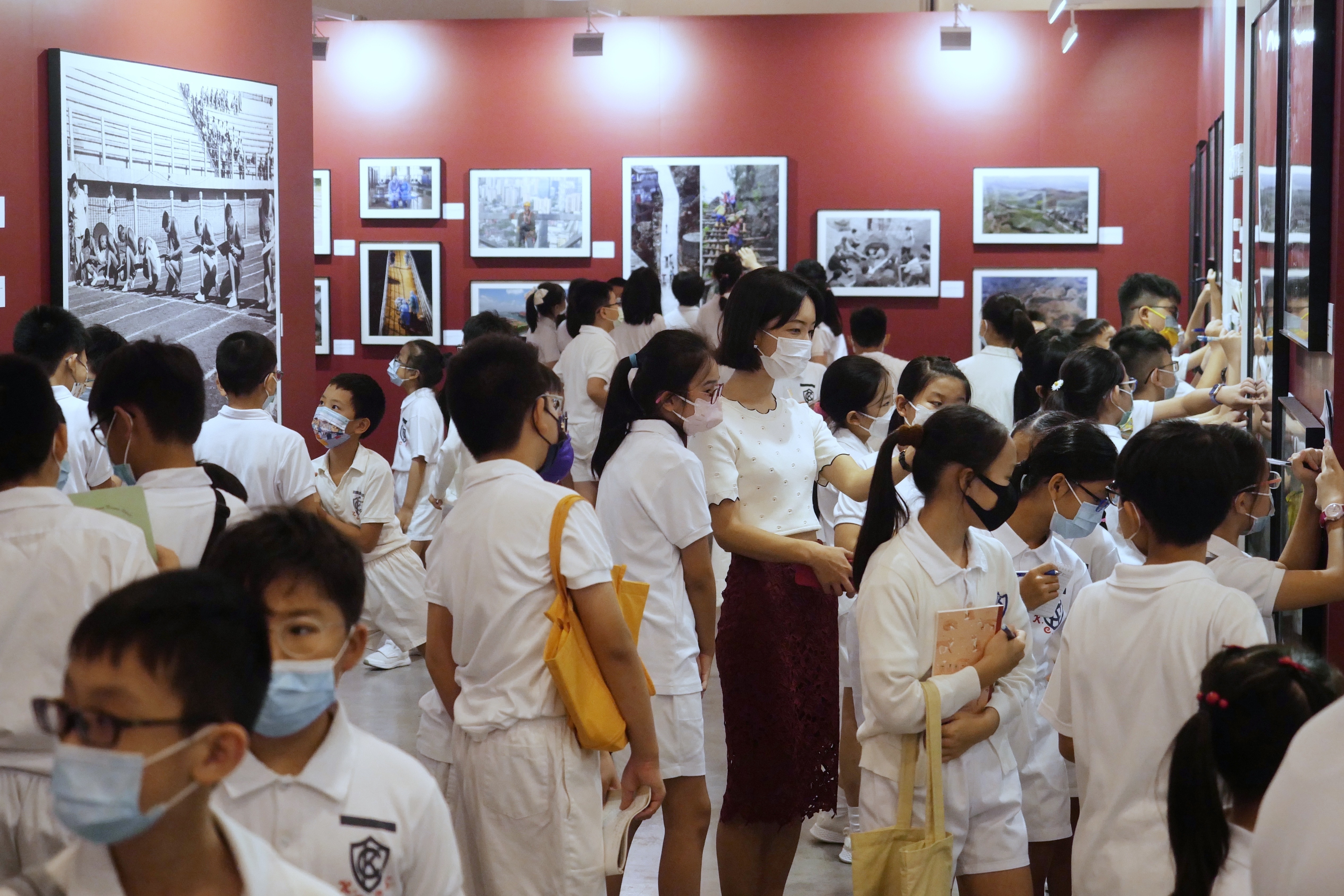2021年10月11日,香港小學生在參觀《國家相冊》大型圖片典藏展。(新華社記者 王申 攝)