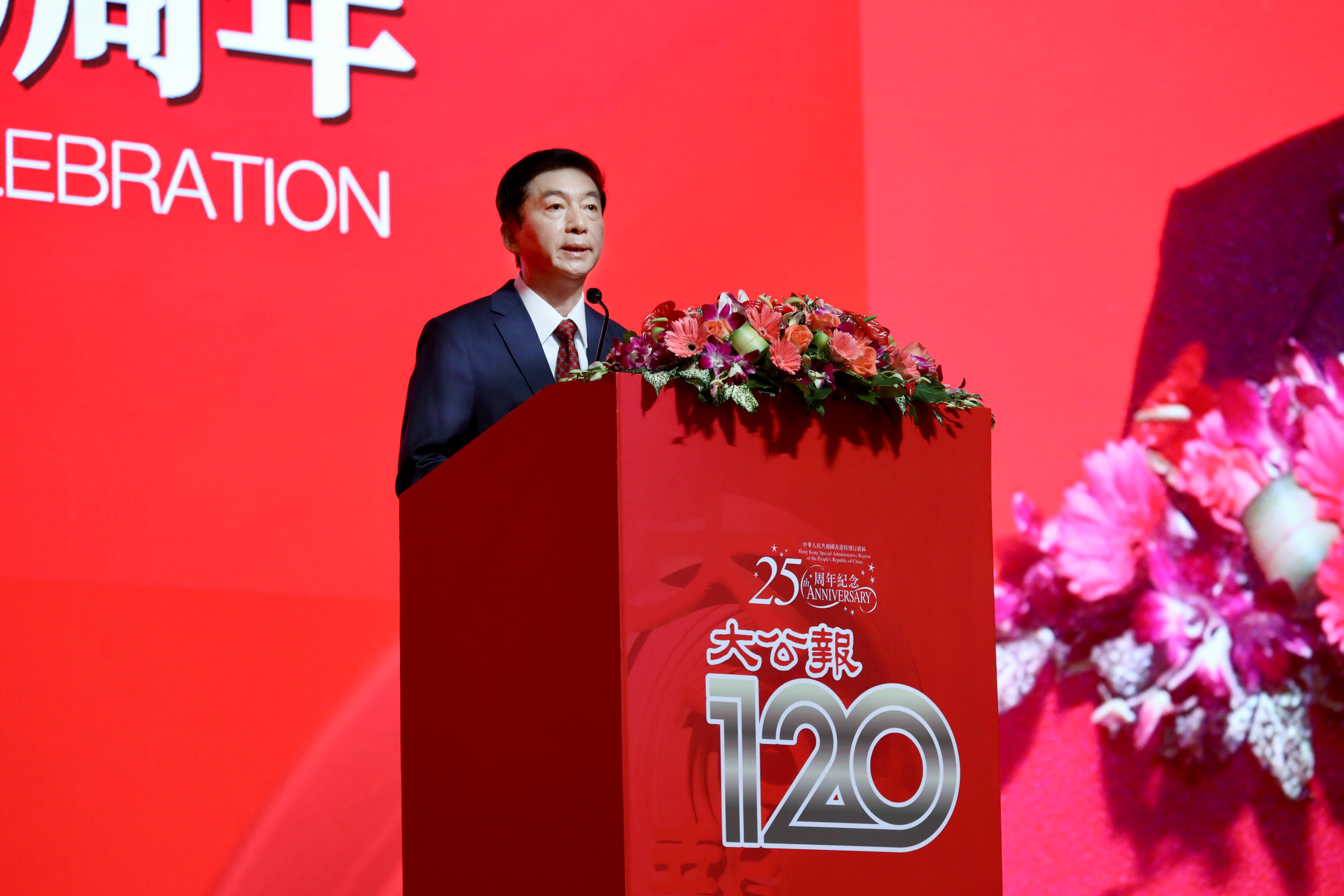 駱惠寧主任在現場宣讀中共中央總書記、國家主席、中央軍委主席習近平給《大公報》的賀信。(圖片來源:中央政府駐港聯絡辦)