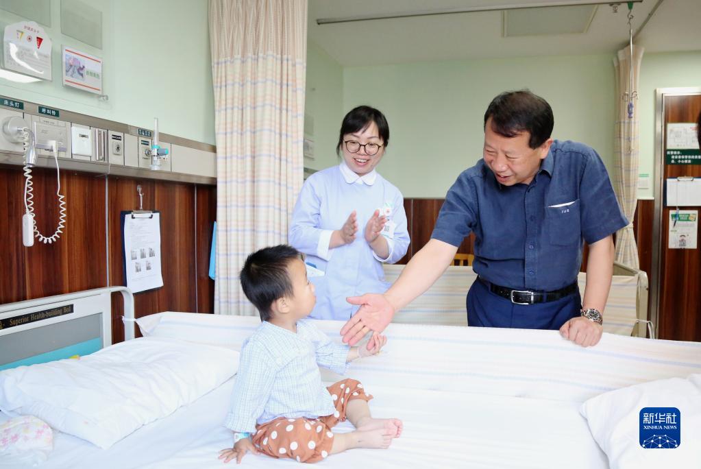 謝俊明(右一)在醫院裏跟兒童患者互動(2019年6月6日攝)。(新華社發)