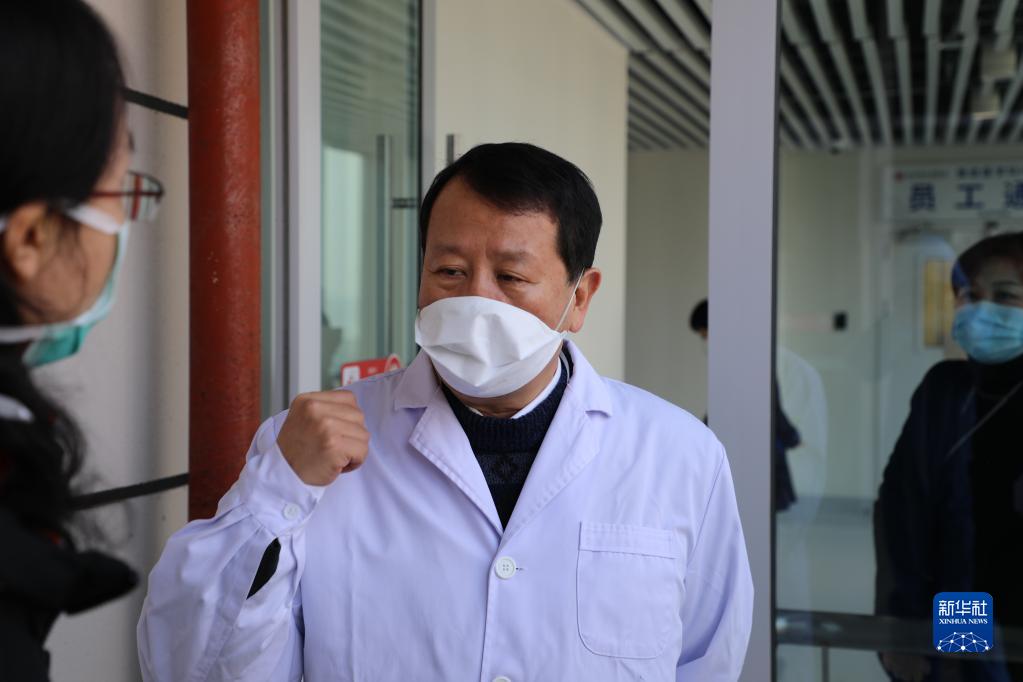 謝俊明在醫院為抗疫醫護人員打氣(2020年1月30日攝)。(新華社發)