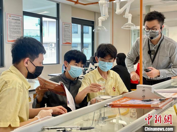 深圳香港培僑書院龍華信義學校學生在上化學實驗課。(董宇桐 攝)