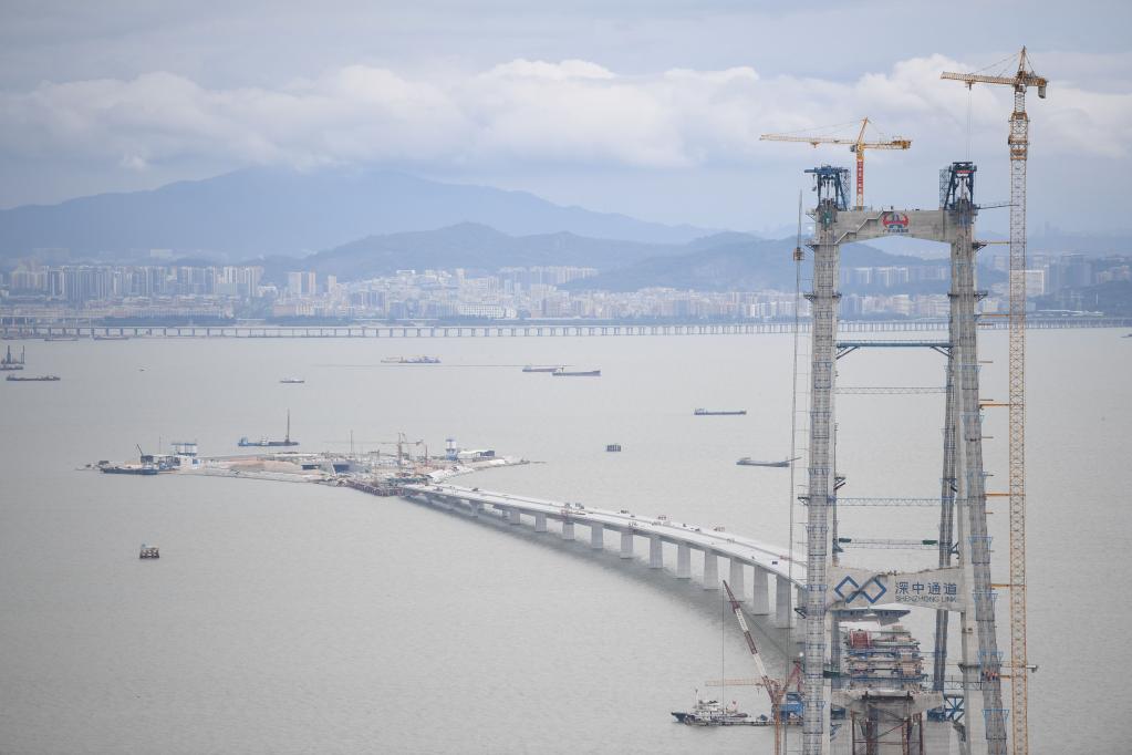 這是2022年6月7日拍攝的深中通道伶仃洋大橋東塔、西人工島及遠處的深圳市區。(新華社記者 鄧華 攝)
