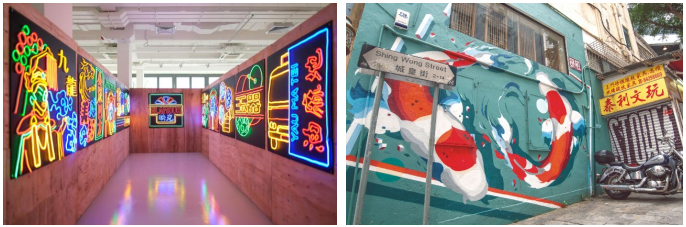 西九龍文化區藝術展覽(左)、荷裏活道中式錦鯉壁畫(右)。(圖源香港旅遊發展局)