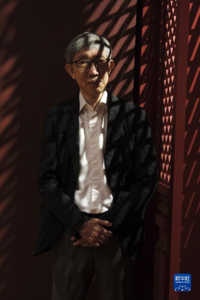 2022年4月28日,香港故宮文化博物館設計師嚴迅奇在展廳內接受新華社記者採訪。(新華社記者 王申 攝)