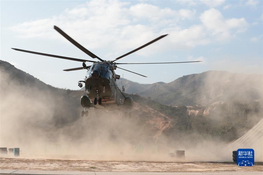 駐香港部隊組織海空聯合巡邏任務,直升機抵達預定位置(2019年2月14日攝)。新華社發(易定 攝)