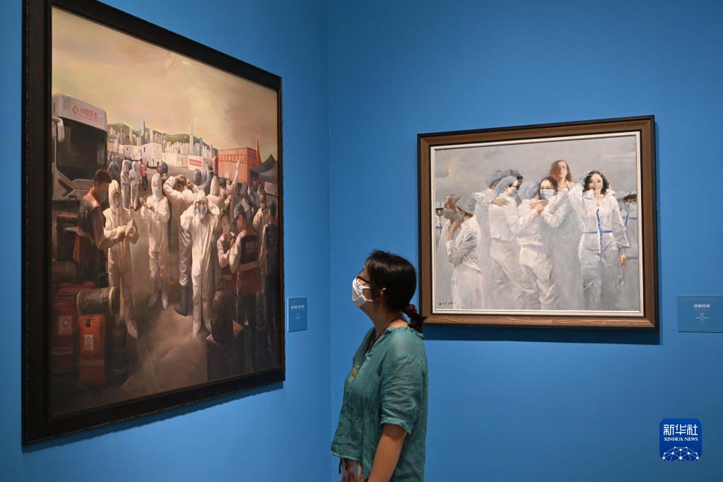 6月24日,參觀者在展覽上觀看作品《逆行出征 同心守護》。(新華社記者 李鑫 攝)