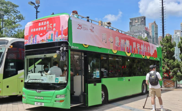 另外,25輛特別版巴士、10輛特別版電車聯合25艘懸挂國旗區旗的大型漁船亦在維港進行巡游慶祝,寓意在中央政府領導下,香港融入國家發展大局,共同走向新時代的征程。
