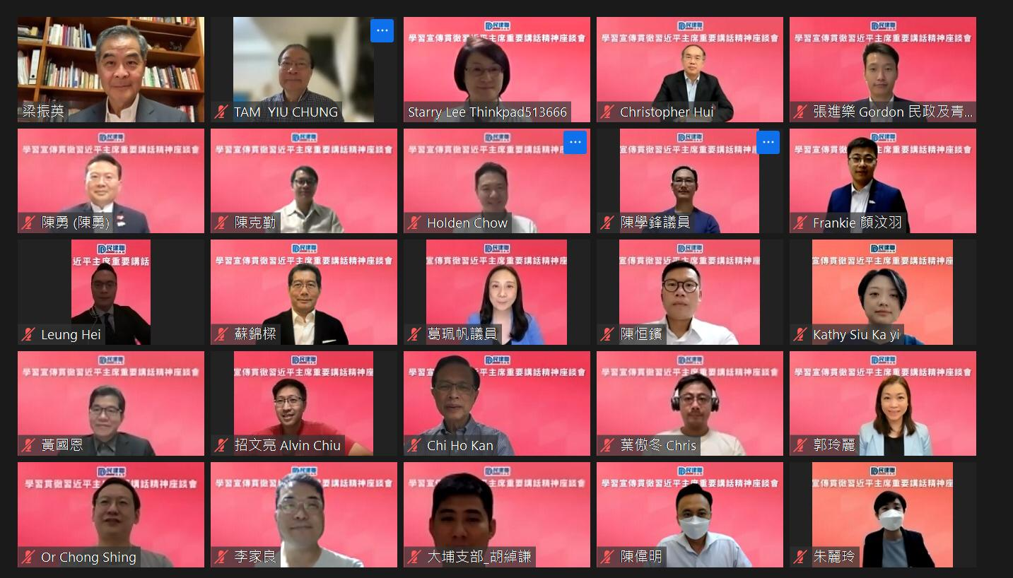 本網訊 7月6日晚,民主建港協進聯盟(民建聯)以線上方式舉辦學習宣傳貫徹習近平主席重要講話精神座談會。民建聯主席李慧琼主持會議,全國政協副主席梁振英、全國人大常委會委員譚耀宗應邀擔任主講嘉賓。民建聯會務顧問、監委、執委、議員、地區和職員骨幹,以及特區政府財經及庫務局局長許正宇、商務及經濟發展局副局長陳百里、政制及內地事務局副局長胡健民等身兼民建聯成員的官員約200人出席。