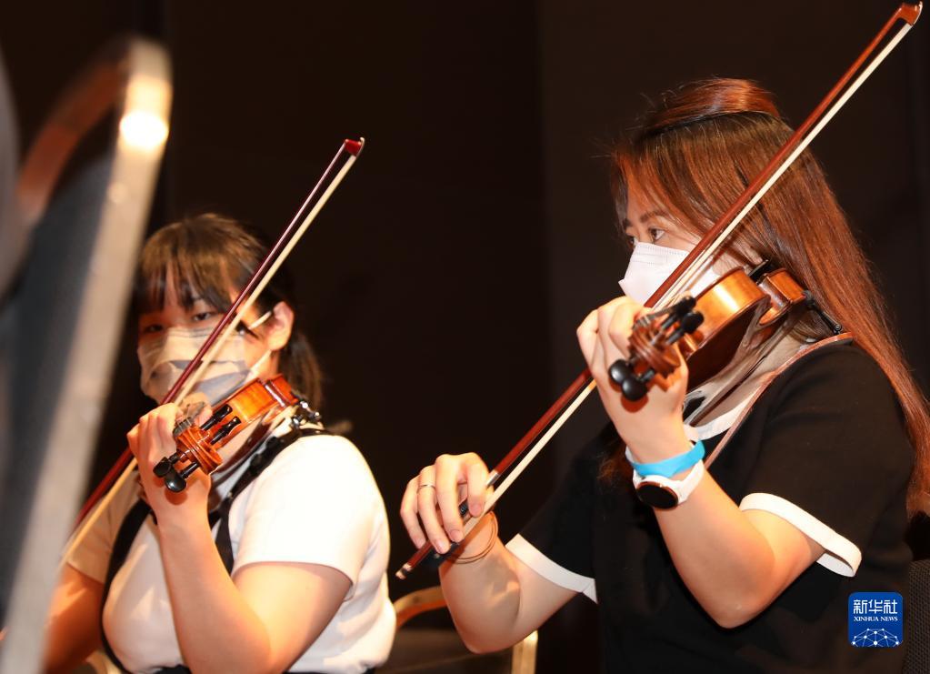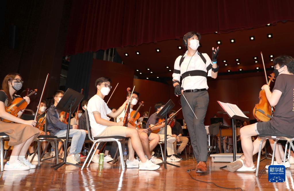 香港浸會大學交響樂團樂手在綵排中演奏(7月11日攝)。(新華社記者 吳曉初 攝)
