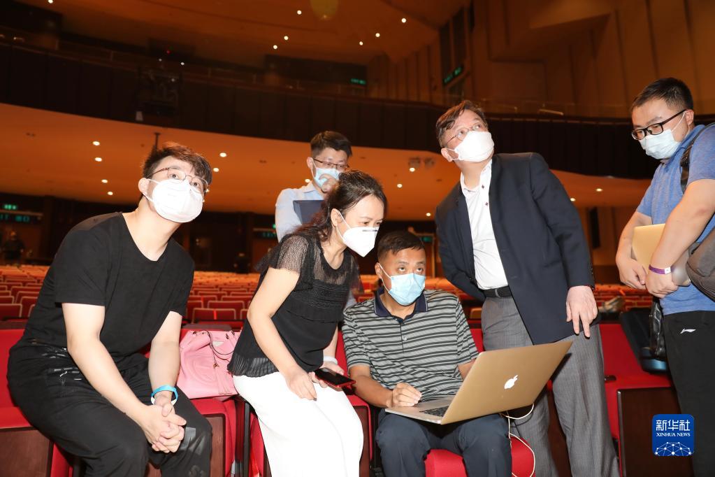 人工智能專家、浸會大學副校長郭毅可(右二)在綵排現場(7月11日攝)。(新華社記者 吳曉初 攝)