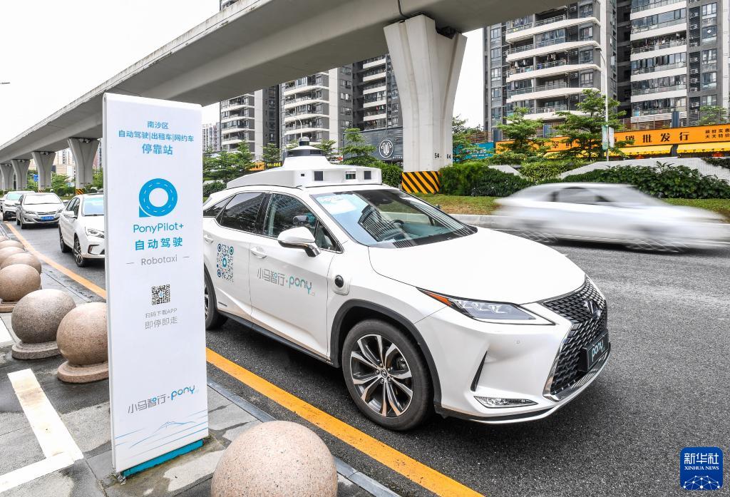 一輛由小馬智行運營的自動駕駛出租車在廣州南沙一個自動駕駛停靠站等待乘客(2022年6月15日攝)。(新華社記者 劉大偉 攝)