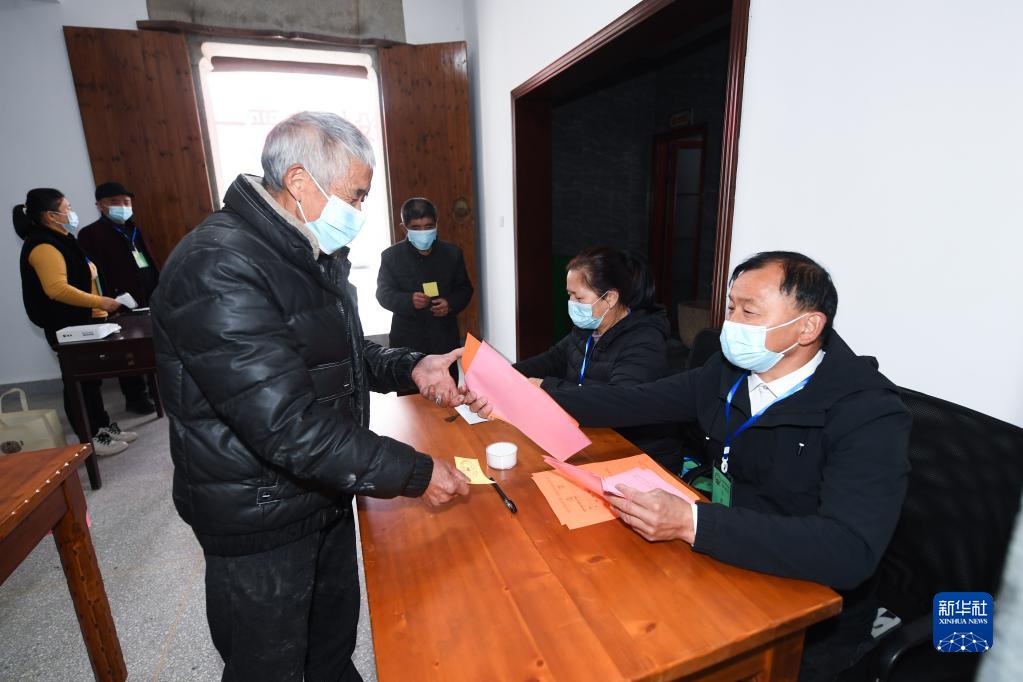 村民在浙江省杭州市臨安區湍口鎮迎豐村的基層投票點領取選票參加基層人大換屆選舉投票(2021年12月14日攝)。(新華社記者 徐昱 攝)