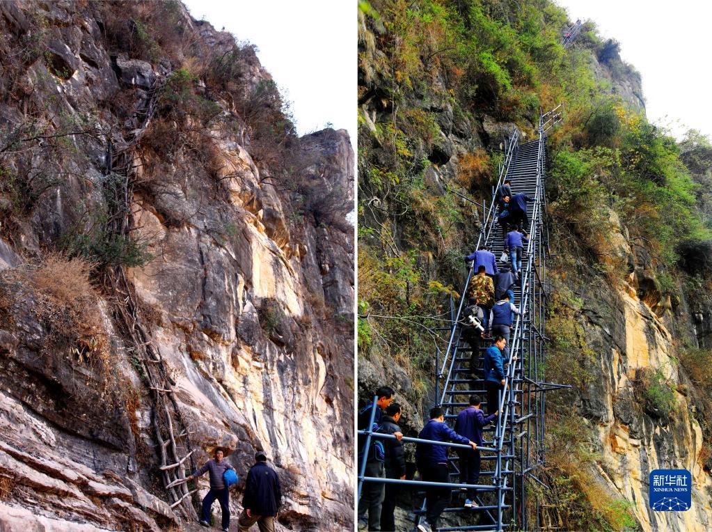 拼版照片:左圖為2013年2月22日拍攝的四川省涼山彝族自治州昭覺縣「懸崖村」阿土勒爾村的藤梯;右圖為2016年11月29日,在四川省涼山彝族自治州昭覺縣,人們沿着剛建好的鋼梯登上「懸崖村」。(新華社發 阿克鳩射 攝)
