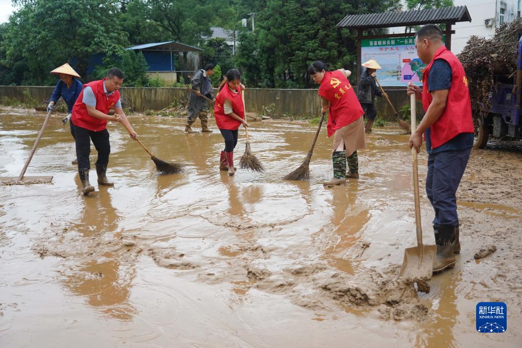 2022年6月21日,在江西省德興市泗洲鎮張家畈社區,黨員幹部在清理淤泥和垃圾。(新華社記者 周密 攝)