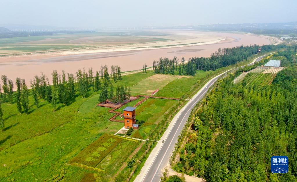 這是2022年8月10日在河南省三門峽市拍攝的黃河生態廊道(無人機照片)。(新華社記者 郝源 攝)