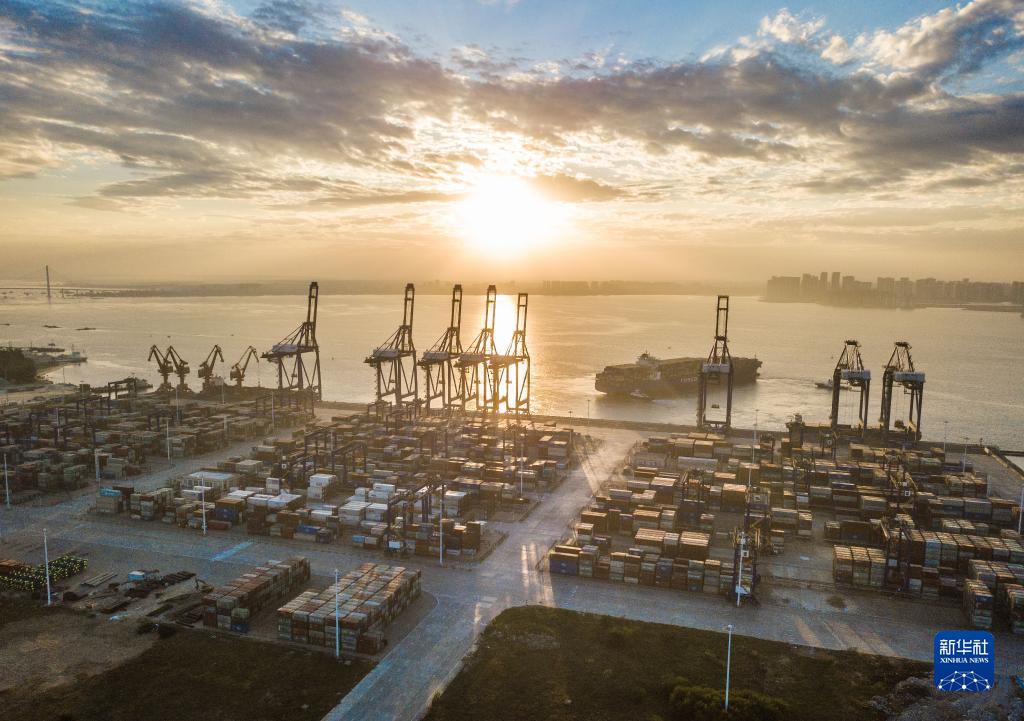 這是2021年12月5日清晨在海南自貿港重點園區洋浦經濟開發區拍攝的洋浦國際集裝箱碼頭(無人機照片)。(新華社記者 蒲曉旭 攝)
