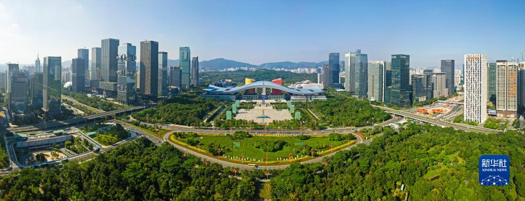這是深圳市民中心和蓮花山公園一線(2020年10月2日攝,無人機照片)。(新華社記者 梁旭 攝)