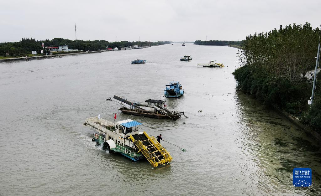 蘇浙滬三地的保潔船在太浦河水域聯合清理水面浮游植物(2020年10月15日攝,無人機照片)。當日,來自蘇州市吳江區、上海市青浦區和嘉興市嘉善縣的三名河長在位於長三角生態綠色一體化發展示範區的蘇浙滬交界水域太浦河流域附近開展聯合巡河活動。(新華社記者 方喆 攝)