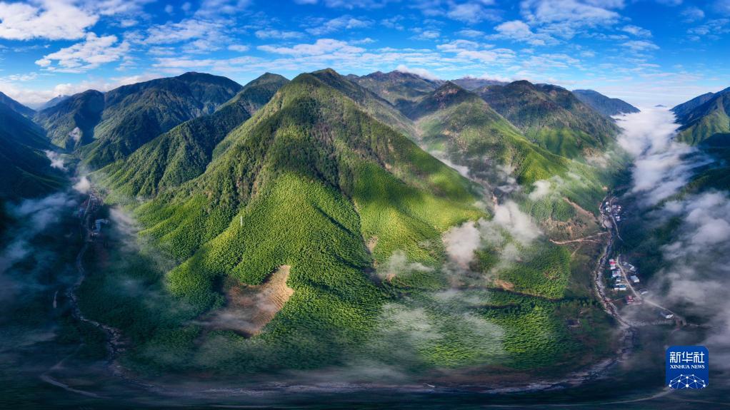 武夷山國家公園武夷斷裂帶峽谷內雲霧繚繞,村莊若隱若現(2020年12月1日攝,無人機照片)。(新華社記者 姜克紅 攝)