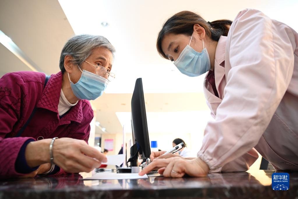 福建省三明市第一醫院的醫保辦工作人員(右)向前來諮詢藥品報銷問題的居民講解相關政策(2020年11月18日攝)。(新華社記者 姜克紅 攝)