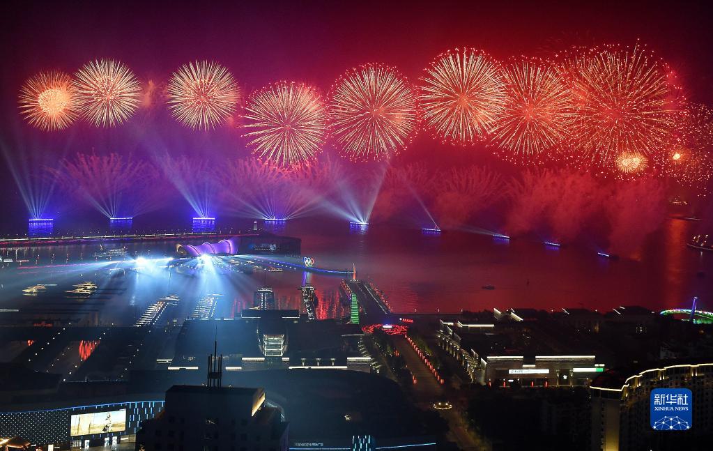 這是2018年6月9日晚在青島舉行的《有朋自遠方來》燈光焰火藝術表演。2018年6月9日至10日,上海合作組織成員國元首理事會第十八次會議在青島召開。(新華社記者 李紫恒 攝)