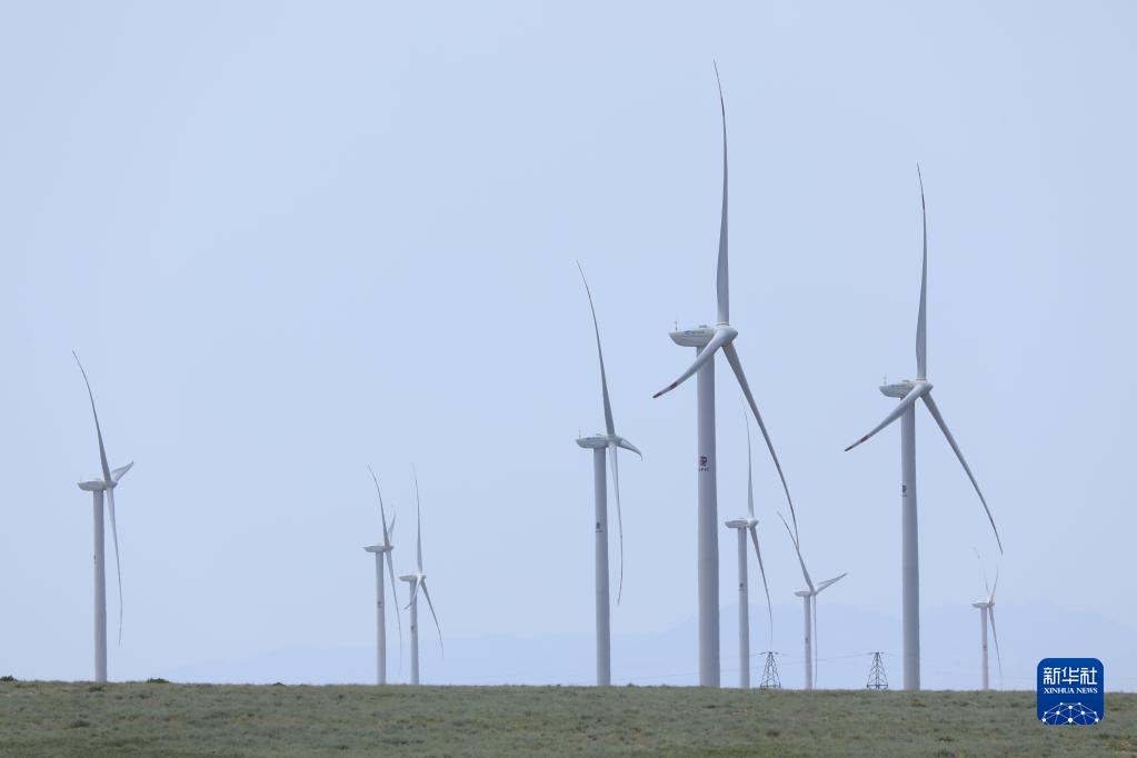 這是2021年5月24日在哈薩克斯坦扎納塔斯拍攝的風電場的風機。新華社發(奧斯潘諾夫攝)