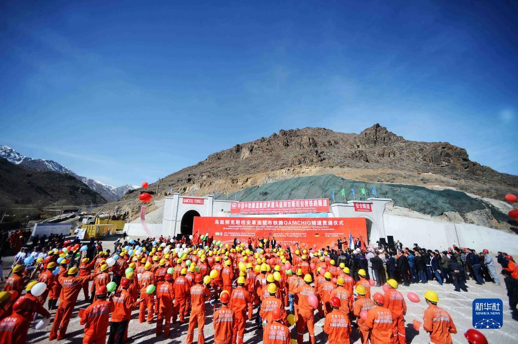 這是2016年2月27日在烏茲別克斯坦「安格連-帕普」鐵路卡姆奇克隧道出口拍攝的全隧貫通儀式現場。(新華社記者 沙達提 攝)