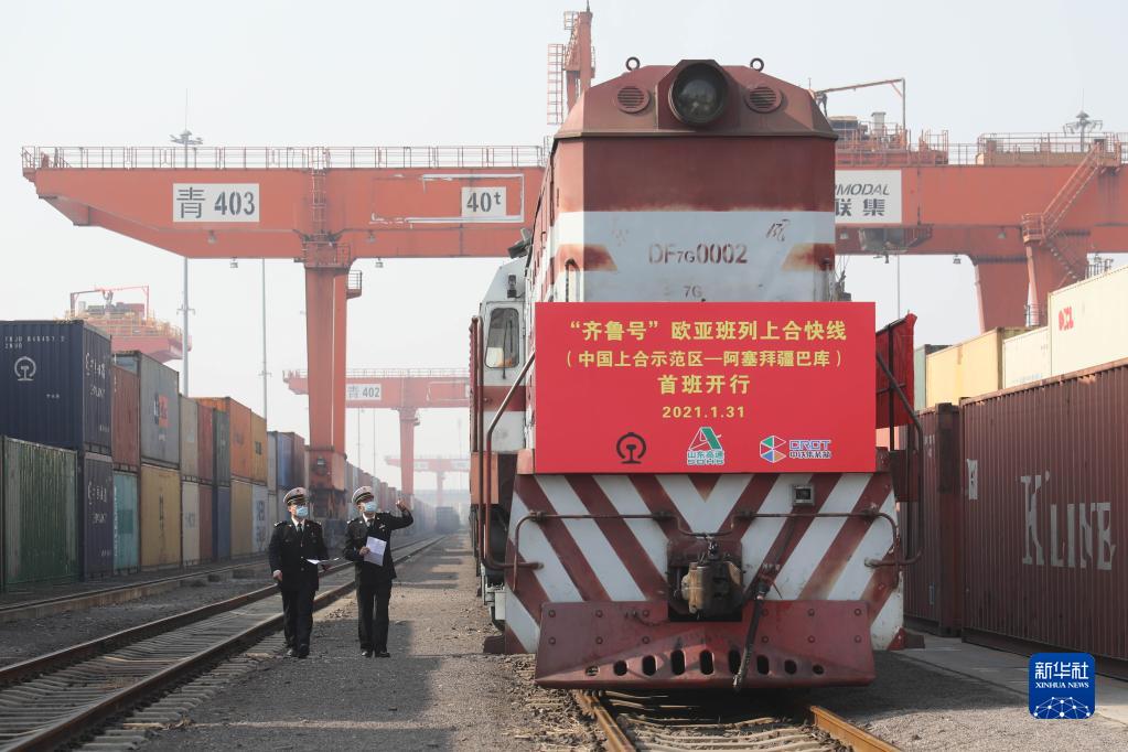 膠州海關關員對「齊魯號」歐亞班列上合快線(中國上合示範區——阿塞拜疆巴庫)線路首班列車進行檢查(2021年1月31日攝)。新華社發(解豪 攝)