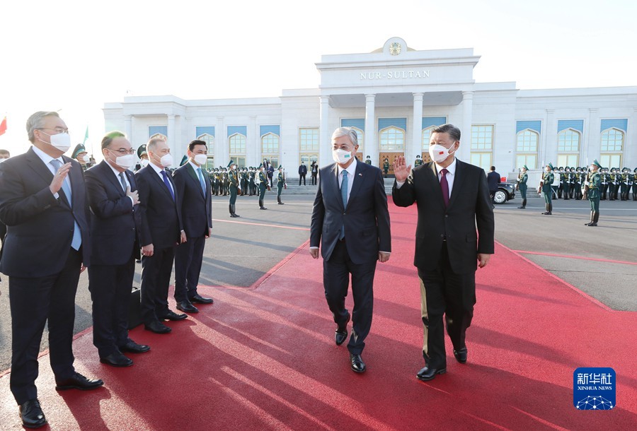 托卡耶夫為習近平舉行隆重歡迎儀式。兩國元首共同登上檢閱台,軍樂團奏中哈兩國國歌。習近平在托卡耶夫陪同下檢閱儀仗隊。