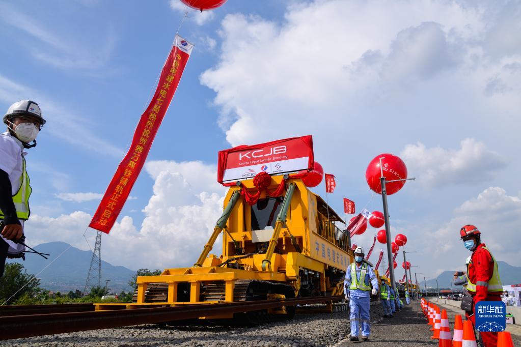 工作人員在印度尼西亞萬隆雅萬高鐵鋪軌施工現場作業(2022年4月20日攝)。(新華社記者 徐欽 攝)