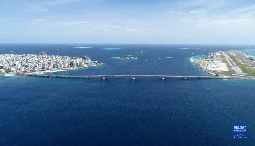 這是在馬爾代夫航拍的連接首都馬累和機場島的中馬友誼大橋(2019年8月30日攝)。(新華社發 王明亮攝)