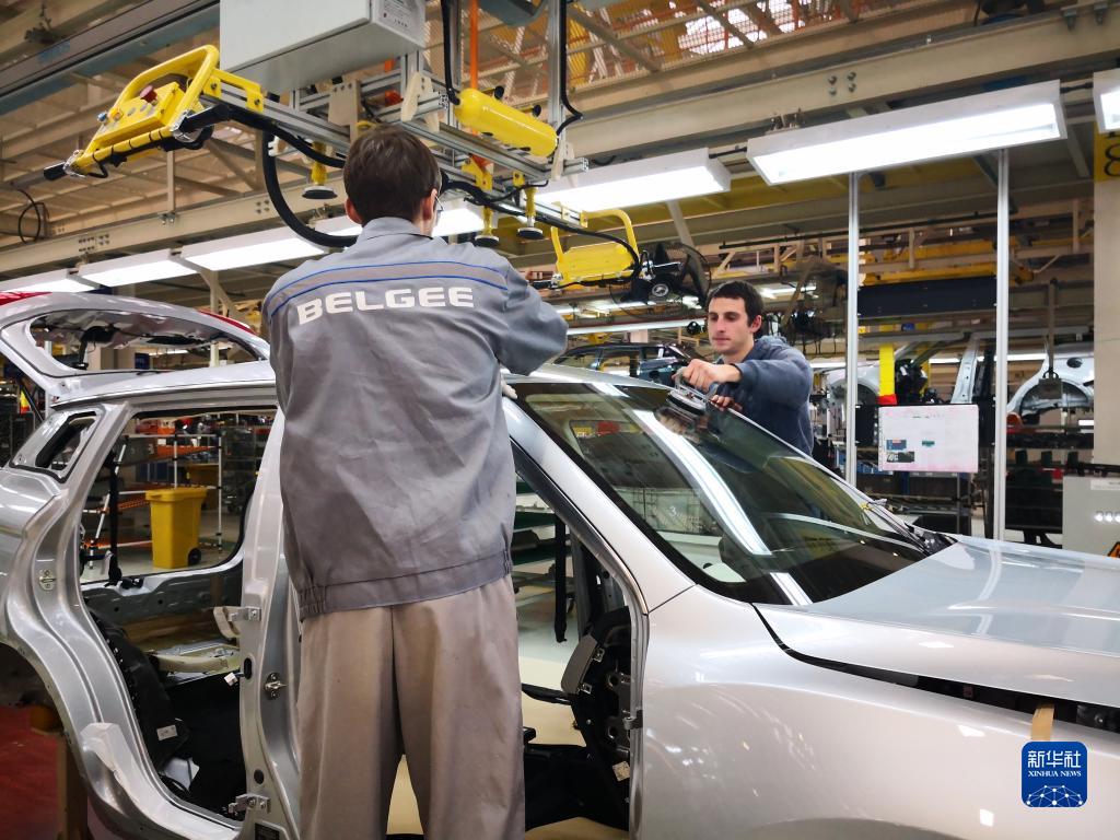 在白俄羅斯首都明斯克東北方向50公里處的白俄羅斯吉利全散件汽車製造廠總裝車間,工人組裝車體(2018年12月1日攝)。(新華社記者 張若玄 攝)