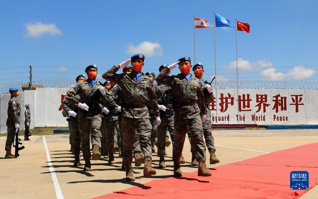 在黎巴嫩南部辛尼亞村的中國維和部隊營區,中國維和部隊官兵在受勳後通過觀禮台(2022年7月1日攝)。(新華社記者 劉宗亞 攝)