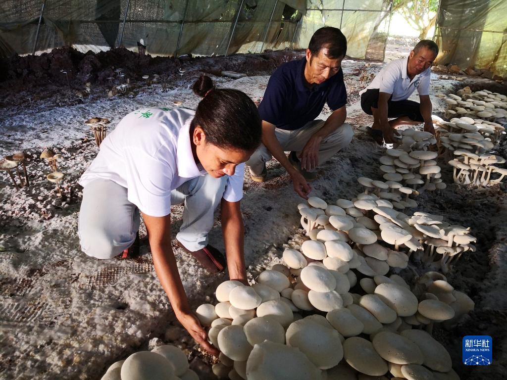 在斐濟楠迪,中國專家和當地僱員檢查菌菇生長情況(2018年6月12日攝)。(新華社記者 張永興 攝)